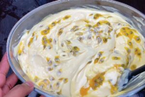 - Em uma tigela, coloque as gemas de ovo peneiradas e adicione a margarina e o sal, misturando bem.