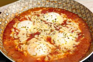 - Cubra com o molho pronto de tomate, salpique muçarela e presunto ralados, polvilhe com orégano e leve por uns 10 minutos ao forno pré-aquecido a 180°C. Se o seu forno tiver grill, deixe-o ligado.