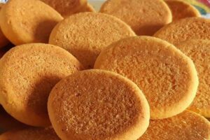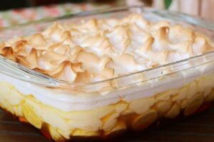 2. Numa travessa coloque uma camada de creme, uma camada de biscoito umedecido na mistura de leite em pó + água.