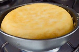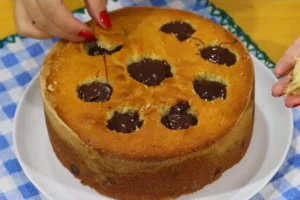 6. Retire, passe uma faquinha sem serra na lateral e centro da forma e desenforme. Se estiver com dificuldade para desenformar, aqueça a forma por alguns segundos na boca do fogão.
