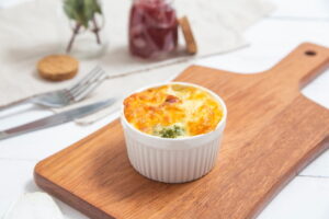 - Num refratário oval (25 cm x 17 cm) coloque uma camada de creme e uma camada de biscoito maisena ou maria umedecido no leite.