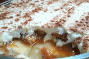 - Em um recipiente de vidro faça uma camada de biscoitos previamente umedecidos no leite, seguida por uma camada do creme.